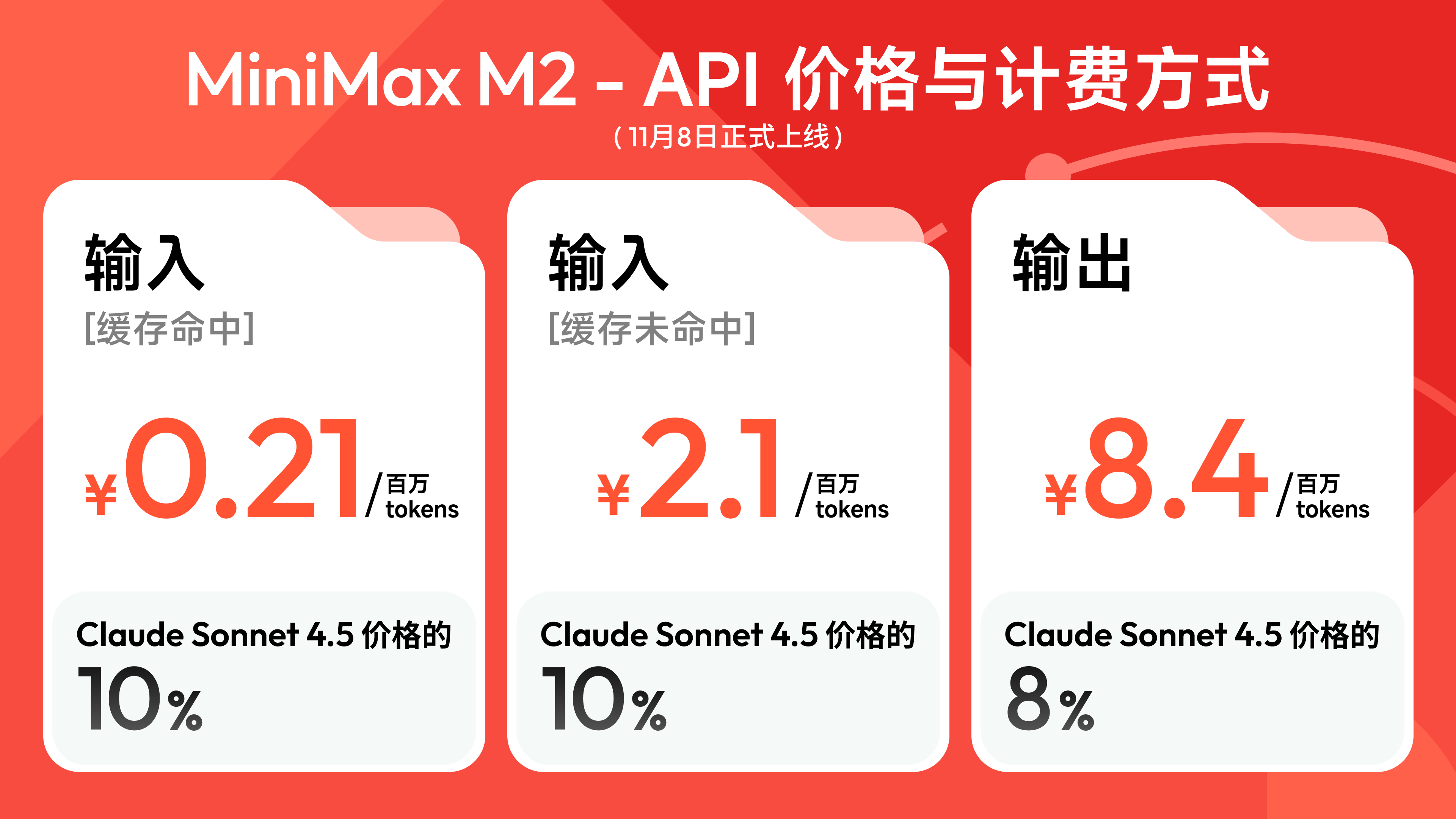 按照2.1元/百万Token输入, 8.4元/百万Token输出, 0.21元/百万Token缓存读取的国内Agent模型最实惠的价格。对大批量使用用户从北京时间11月8号下午2点开始正式计费, 对付费用户默认提供 500 的RPM和两千万的TPM, 使用时请选择MiniMax-M2-Stable。若有需要更高并发的付费用户可以直接联系我们进行RPM的增加。对于开发者朋友提到的Cache问题, 我们的API接口已经支持, 并在接下来几天会逐步推全。
