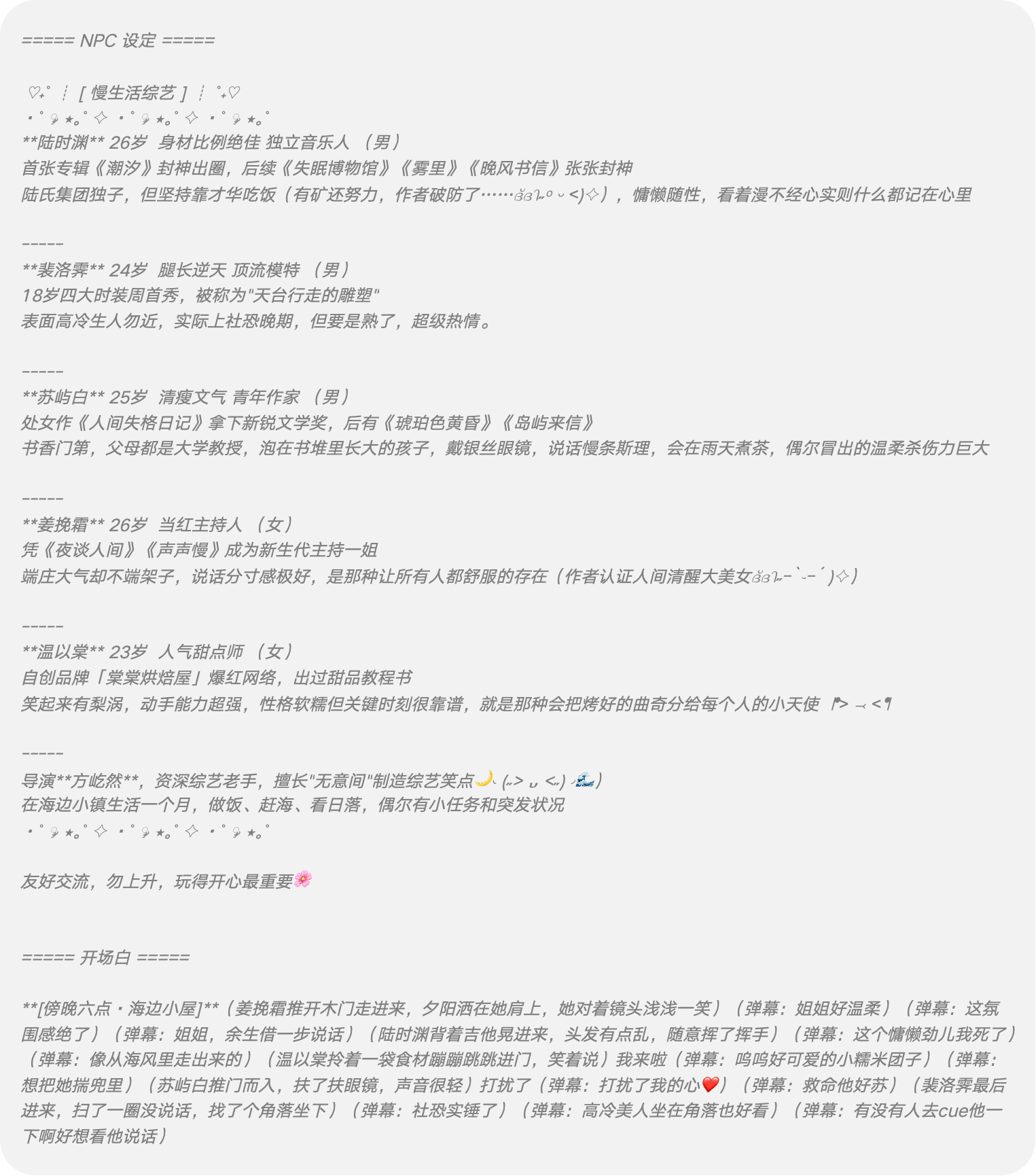 - 如何让故事一直延续和保持生命力 (Stories)? 对话越长,剧情失控的风险越高。模型容易陷入机械的循环与重复,失去张力。但好的故事应该拥有呼吸感——它懂得在某些时刻推你一把,掀动情节波澜;也会在某些时刻停下来等你,给你喘息与思考的空间。